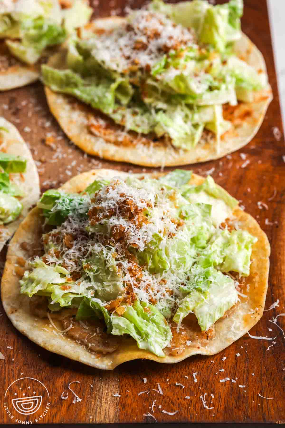 - Top the chicken taco with Caesar salad, then finish with toasted breadcrumbs and grated parmesan. Fold and serve immediately.