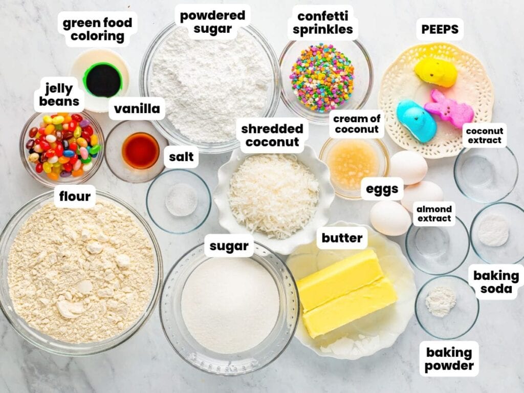 - No coconut option: If you are avoiding coconut for any reason, you can skip the coconut grass and frosting and use plain buttercream instead. You can tint the frosting green if you still want the same Easter grass look without using coconut.