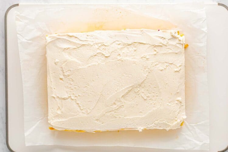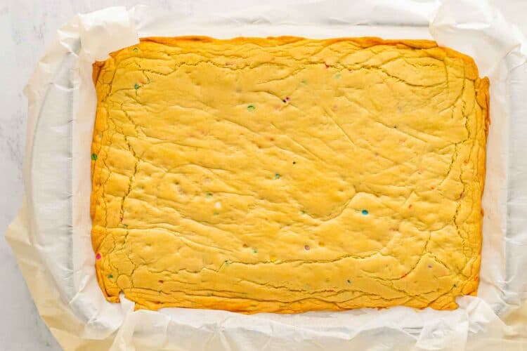 - Lift the cooled cookie slab out of the pan using the parchment paper. Spread the frosting evenly over the top.